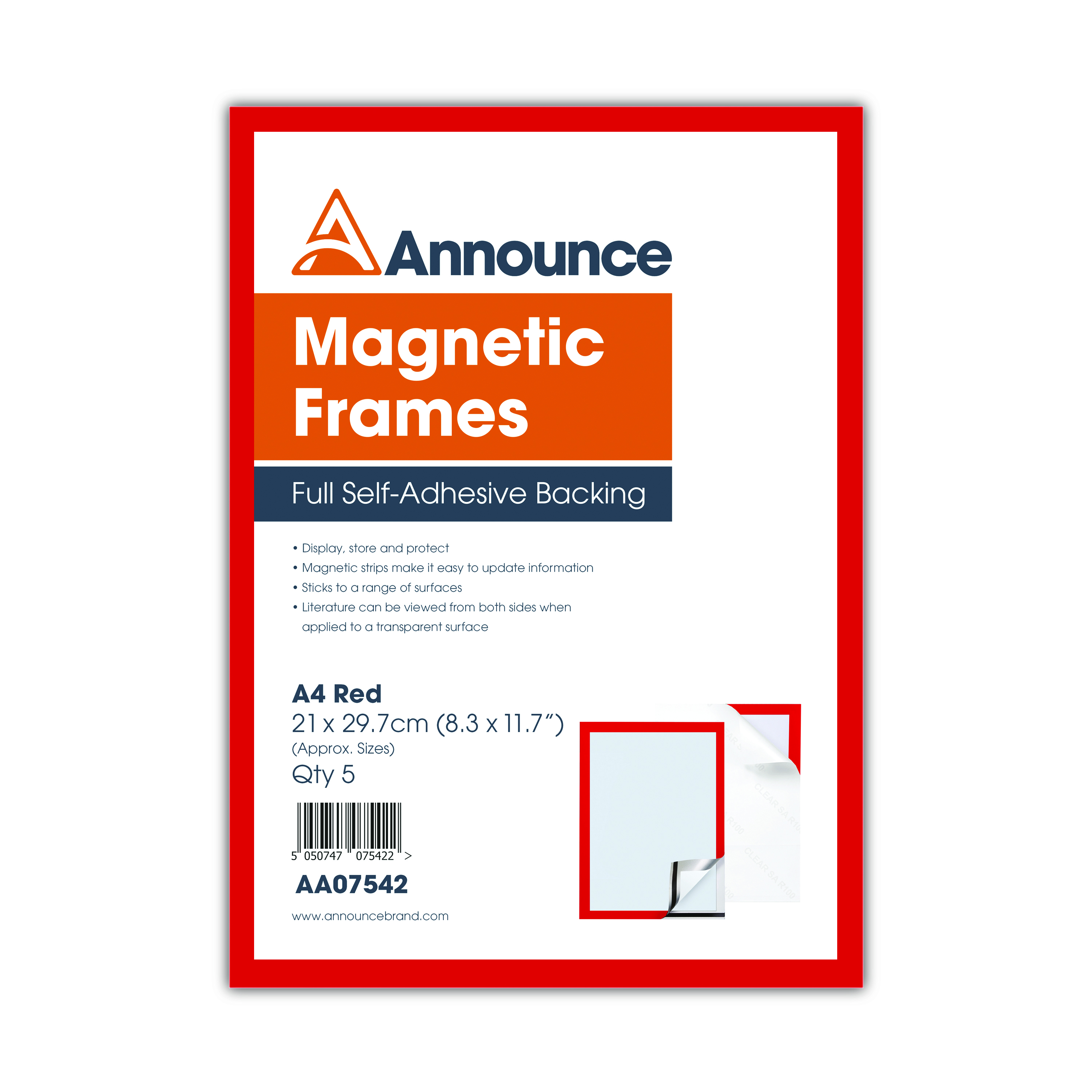 Easily display notice and information with this Announce Magnetic Frame. Ideal for use with in-company communication as well as public information, you can easily update information with the magnetic strip. It will stick on any non-porous surface and remove easily without leaving any residue.